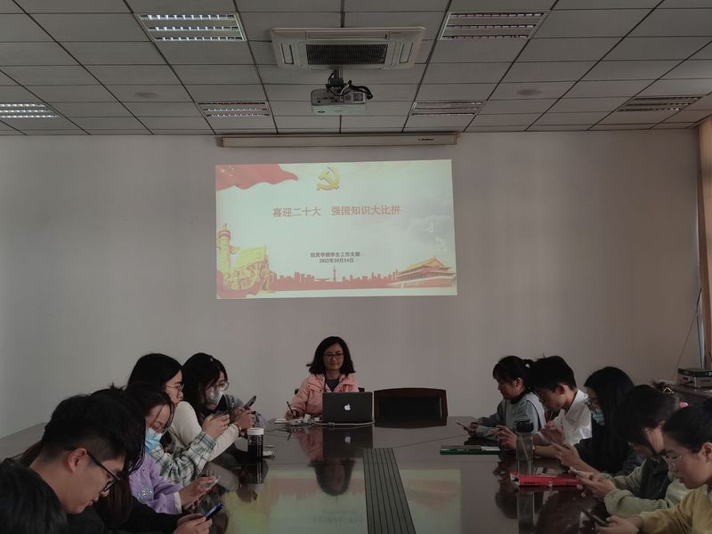 为进一步推动全党深入学习贯彻习近平新时代中国特色社会主义思想和迎接党的二十大顺利召开,巩固拓展党史学习教育成果,推动党史学习教育常态化长效化,2022年10月14日,经贸学院党总支学工支部依托学习强国平台,开展“双人对战答题赛”主题党日活动。活动由支部书记蒋文贤主持,支部在校全体学生党员参加了此次活动。