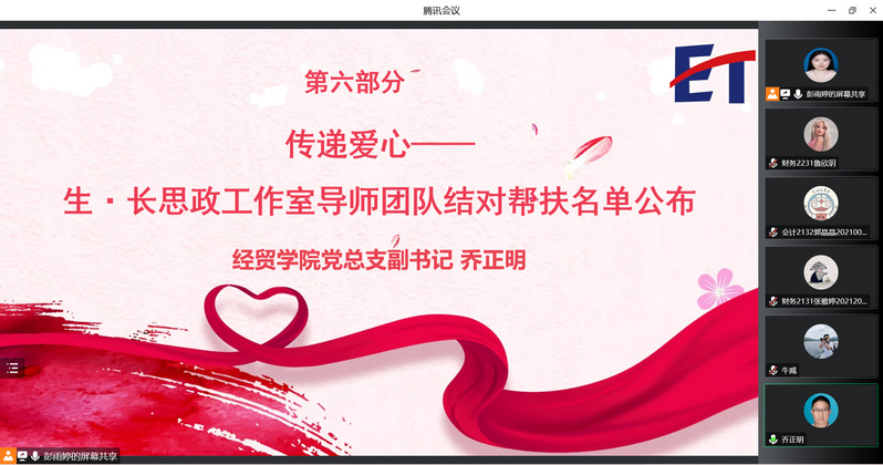 温暖寒冬,情暖经贸。为帮助家庭经济困难学生切实解决学习和生活问题,进一步做好学生资助工作,经贸学院启动2022年暖冬助学行动。12月14日,经贸学院暖冬助学行动启动仪式在线举行,经贸学院党总支书记林洁、副书记乔正明、全体辅导员老师以及校友代表牛威、受资助学生代表参加了启动仪式。