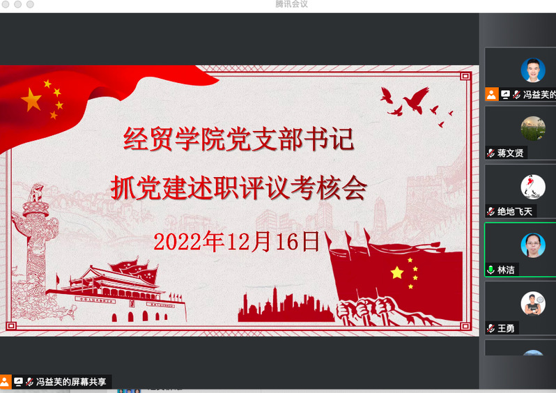 为深入学习贯彻习近平新时代中国特色社会主义思想和党的二十大、十九大及历届全会精神,贯彻落实全国、全省第二十七次高校党的建设工作会议精神,推动党支部书记履职尽责抓党建、落实管党治党政治责任,12月16日下午15:30,经贸学院党总支召开2022年党支部书记抓党建述职考核会议。此次会议采用线上线下结合的形式召开,会议由经贸学院党总支书记林洁主持,经贸学院领导班子成员、分工会主席、分团委书记、各支部委员、教师党员代表参加了此次会议。